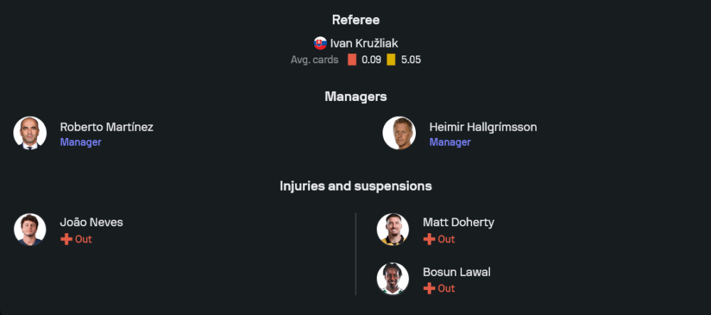 ชุดหลักอยู่กันพร้อมหน้า ยกเว้น เชา เนเวส ห้องเครื่องดาวรุ่งที่เดี้ยงถอนตัวไป สายรุกจัดเต็มวาง คริสเตียโน่ โรนัลโด้ ยืนหน้าเป้า โดยมีสามจอมปั้นเกม บรูโน่ แฟร์นานเดส, แบร์นาร์โด้ ซิลวา และ เชา เฟลิกซ์ สนับสนุน ใต้กลางใช้พลังคุมจังหวะของ วิตินญ่า ผนึก รูเบน เนเวส แผงหลังยึดคู่เซ็นเตอร์ รูเบน ดิอาส จับคู่ ราฟาเอล เวยก้า ขนาบด้วยแบ็กสปีดจัด นูโน่ เมนเดส กับ เนลสัน เซเมโด้ นายด่านยังเป็น ดิโอโก้ คอสต้า ที่เซฟสำคัญได้เรื่อย