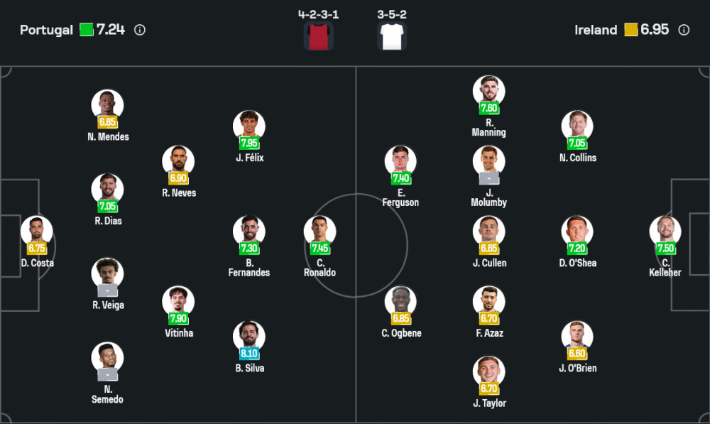 รูปเกมคาดว่าโปรตุเกสครองบอลมากกว่า ไล่ปาดไปมารอบกรอบเขตโทษไอร์แลนด์ที่ยืน 5-3-2 ตอนรับต่ำ คีย์เวิร์ดจุดตัดสินอยู่ที่พื้นที่ระหว่างเซ็นเตอร์กับวิงแบ็กของทีมเยือนซึ่งมักเปิดช่องให้วิ่งตัด และนั่นคืออาณาเขตถนัดของ เฟลิกซ์ กับ แบร์นาร์โด้ ในการเล่นชิ่งหนึ่งสอง ก่อนจบด้วยโรนัลโด้หรือทางสองจาก บรูโน่ อีกชั้น นอกจากนี้ลูกนิ่งยังกลายเป็นอาวุธร้ายของฝอยทอง เมื่อมีทั้งคนเปิดคมและตัวโหม่งดี ความหนาแน่นของการรุกต่อเนื่องจะบีบให้ไอร์แลนด์เสียสมาธิและเสียฟาวล์มากขึ้น