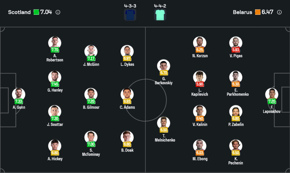 กุญแจสำคัญอยู่ที่ความเฉียบคมของแนวรุกสกอตแลนด์ โดยเฉพาะ แม็คโทมิเนย์ ที่มักสอดขึ้นมายิงประตูได้บ่อยครั้ง ประกอบกับ โรเบิร์ตสัน และ แม็กกินน์ ที่เป็นตัวขับเคลื่อนเกมฝั่งซ้ายอย่างมีประสิทธิภาพ หากได้ประตูนำเร็ว เบลารุสน่าจะพังทลายไม่ต่างจากเกมที่แพ้เดนมาร์ก 0-6 เมื่อไม่กี่วันก่อน