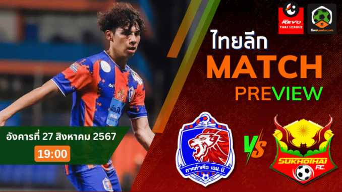สุโขทัย เอฟซี ที่อยู่อันดับที่ 5 ฟอร์มการเล่นของพวกเขาเพิ่งจะกลับมาดีขึ้นหลังจากที่เปิดบ้านชนะ ประจวบคีรีขันธ์ เอฟซี 2-0 ในเกมล่าสุด นับเป็นชัยชนะครั้งแรกในรอบ 5 เกมหลังจากที่ไม่ชนะใครมา 4 เกมติดต่อกัน โดยแพ้ไปถึง 3 เกม ทำให้ต้องการการเก็บคะแนนเพิ่มเพื่อกลับมาอยู่ในฟอร์มที่ดีขึ้น
