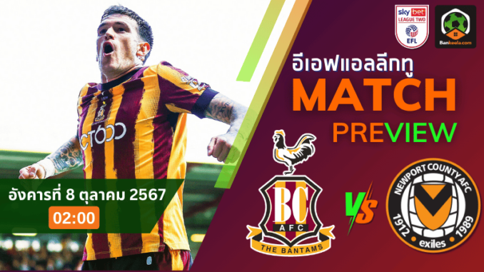 วิเคราะห์บอลอีเอฟแอลลีกทู 2024 แบร็ดฟอร์ด ซิตี้ พบ นิวพอร์ต เคาน์ตี้ วันอังคารที่ 8 ตุลาคม 2567