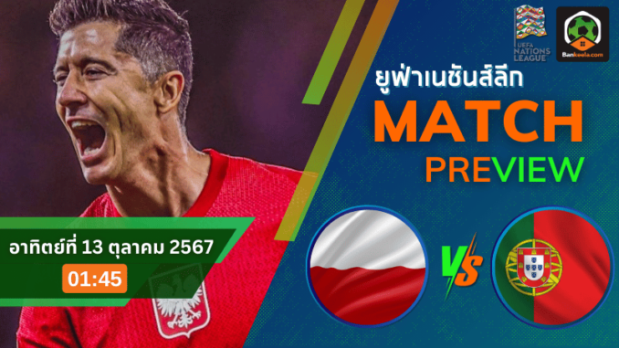 ศึกใหญ่ในศึก ยูฟ่าเนชันส์ลีก 2024 ระหว่างทีมชาติ โปแลนด์ และ โปรตุเกส ซึ่งจะแข่งขันกันในคืนวันอาทิตย์ที่ 13 ตุลาคม 2567 เวลา 01.45 น. ณ สนามของโปแลนด์ สำหรับโปรตุเกสที่เก็บ 6 คะแนนเต็มจาก 2 นัดแรก ยังคงเป็นทีมจ่าฝูงของกลุ่ม ขณะที่โปแลนด์เก็บได้ 3 คะแนน และหวังจะคว้าชัยในบ้านเพื่อเพิ่มโอกาสลุ้นเข้ารอบต่อไป เกมนี้คาดว่าจะเป็นการดวลกันอย่างดุเดือดระหว่างสองทีมชั้นนำของยุโรป