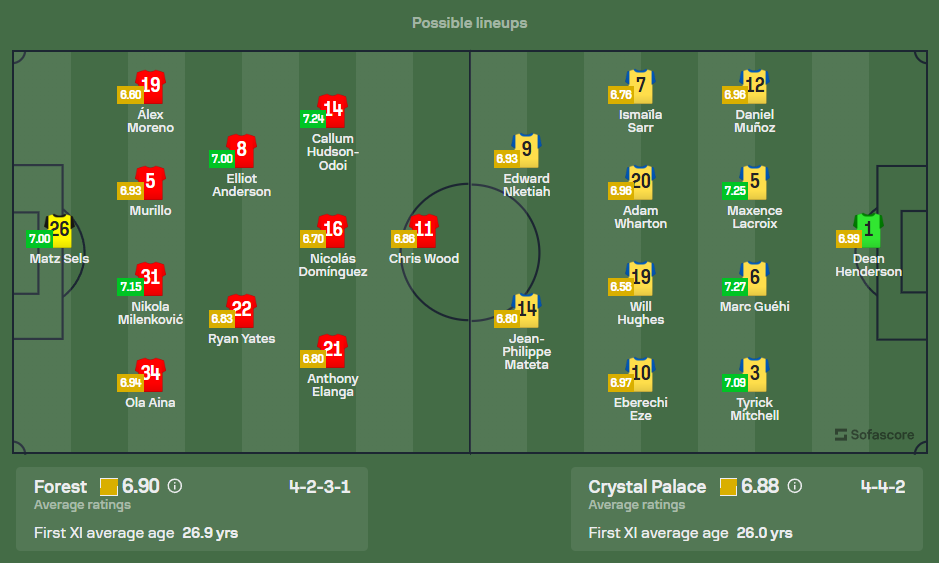 สำหรับน็อตติ้งแฮม ฟอเรสต์ เกมนี้จะไม่มีนักเตะตัวหลักอย่าง ดานิโล และ อิบราฮิม ซังกาเร่ ที่ยังคงมีอาการบาดเจ็บ ขณะเดียวกัน แมต เซลส์ และ มอร์แกน กิบส์-ไวต์ คาดว่าจะพร้อมกลับมาลงสนามช่วยทีม นอกจากนี้ เจมส์ วอร์ด-พราวส์ จะไม่สามารถลงสนามได้เนื่องจากติดโทษแบนจากการสะสมใบเหลือง เกมนี้ ฟอเรสต์ น่าจะมาในแผน 4-2-3-1 พร้อมสามแนวรุกอย่าง เอเลียต แอนเดอร์สัน, มอร์แกน กิบส์-ไวต์ และ คัลลัม ฮัดสัน-โอดอย ส่วนกองหน้าตัวเป้าเป็น คริส วู้ด ที่หวังจะยิงประตูชัยให้กับทีม