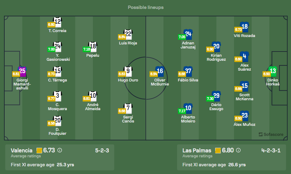 ทีมเจ้าถิ่น บาเลนเซีย ยังคงเจอปัญหาเรื่องความพร้อมของผู้เล่น โดยพวกเขาจะขาดนักเตะสำคัญหลายราย ทั้ง ราฟา เมียร์ ตัวรุกวัย 27 ปี ที่ติดโทษแบน รวมถึง ฆูอาเม่ โดเมเน็ค และ มุกต้าร์ ดิอาคาบี้ ที่ยังไม่สามารถฟื้นฟูร่างกายได้ทัน อย่างไรก็ตาม บาเลนเซียยังมีผู้เล่นหลักจากเกมล่าสุดที่จะลงสนามครบครันในระบบ 4-2-3-1 โดย อูโก้ ดูโร่ จะเป็นตัวหลักในแดนหน้า พร้อมกับการสนับสนุนจากกองกลางที่ยังคงแข็งแกร่ง