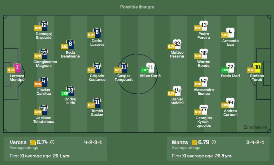 จากสถิติการเจอกันของทั้งสองทีม เกมล่าสุดที่พบกัน มอนซ่า เปิดบ้านเสมอ เวโรน่า ไป 0-0 และเมื่อมองย้อนกลับไป 4 นัดหลังสุด เวโรน่าไม่เคยเก็บชัยชนะได้เลย โดยเสมอไป 2 นัด และแพ้ 2 นัด ขณะที่สถิติโดยรวมของการพบกัน 10 นัดหลังสุด เวโรน่าชนะไป 4 นัด เสมอ 2 และแพ้ 4 นัด แสดงให้เห็นว่าทั้งสองทีมมีสถิติการพบกันที่สูสีกันมาก แต่เมื่อพูดถึงฟอร์มในปัจจุบัน เวโรน่าดูจะมีโอกาสที่ดีกว่าในการเก็บชัยชนะ