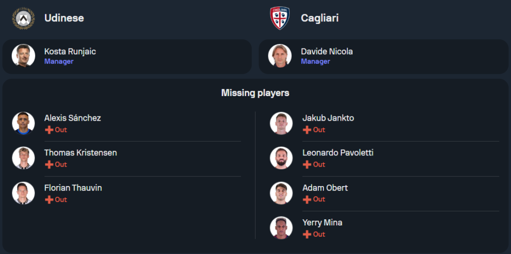 ด้านทีมเยือน กาญารี่ กุนซือ ดาวิเด้ นิโคล่า ต้องเผชิญกับปัญหาผู้เล่นบาดเจ็บเช่นเดียวกัน โดยมี มาเตอุสซ์ เวียเตสกา และ เลโอนาร์โด้ ปาโวเล็ตติ ที่ยังไม่สามารถลงสนามได้ แต่ก็มาพร้อมข่าวดีเมื่อได้ อดัม โอเบิร์ต หายเจ็บกลับมาช่วยทีม อย่างไรก็ตาม คู่กองหลังหลักอย่าง เยร์รี่ มิน่า และ เซบาสเตียโน ลูแปร์โต้ ยังลงสนามได้อย่างดีในระบบ 3-4-2-1 โดยเกมรุกจะใช้ นิโคลัส วิโอล่า และ ซิโต้ ลูวุมโบ ช่วยกันสร้างสรรค์โอกาสในการทำประตู และให้ โรแบร์โต้ ปิคโคลี เป็นกองหน้าตัวเป้า