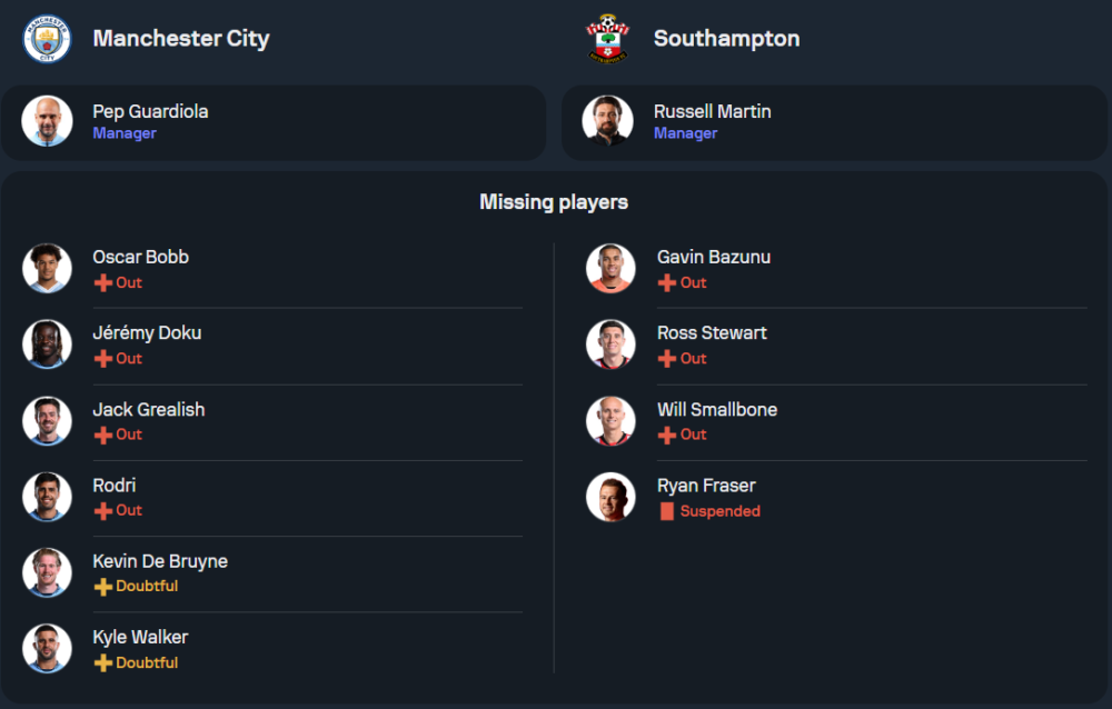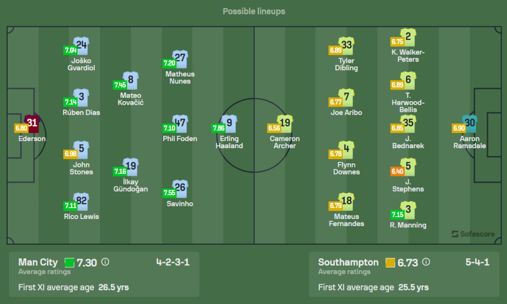 ทีมของ เปป กวาร์ดิโอลา จะขาดนักเตะคนสำคัญอย่าง ออสก้า บ๊อบบ์, โรดรี้, เควิน เดอ บรอยน์, เฌเรมี่ โดกู, แจ็ค กรีลิช และ ไคล์ วอร์คเกอร์ ที่ยังมีอาการบาดเจ็บ ส่วนที่เหลือพร้อมเต็มที่ คาดว่าซิตี้จะมาในระบบ 4-2-3-1 โดยมี ซาวินโญ่, แบร์นาโด้ ซิลวา และ ฟิล โฟเด้น ร่วมกันสร้างสรรค์เกมบุก ส่วนหน้าเป้าคงเป็นใครไม่ได้นอกจาก เออร์ลิง ฮาแลนด์ ที่พร้อมถล่มประตู