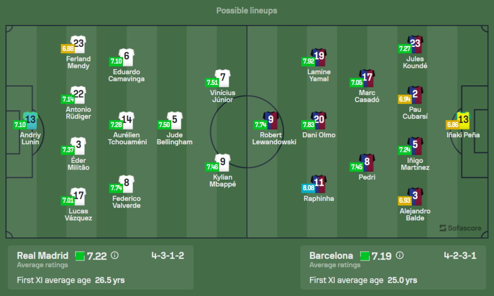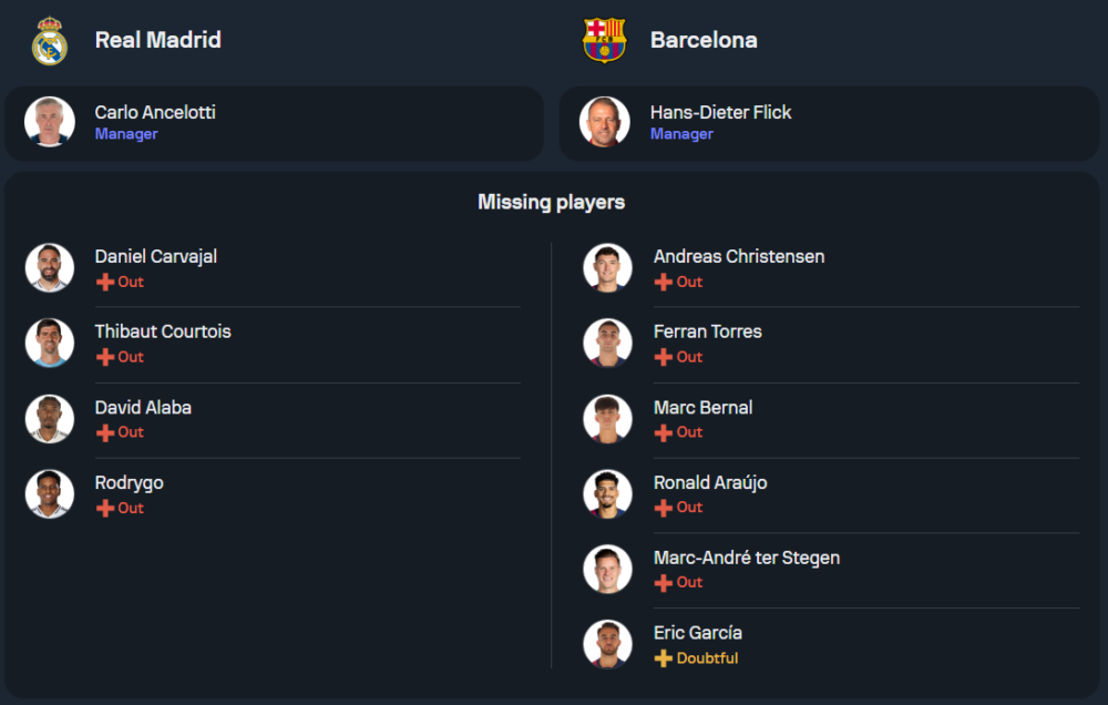 คาร์โล อันเชล็อตติ กุนซือเรอัล มาดริด เจอปัญหาผู้เล่นตัวหลักบาดเจ็บอยู่หลายราย เช่น ดานิ การ์บาฆัล ซึ่งถูกแทนที่ด้วย ลูคัส บาสเกซ และผู้เล่นอย่าง บราฮิม ดิอ๊าซ, ดาวิด อลาบา และ ติโบต์ กรูตัวส์ ก็ไม่สามารถลงสนามได้ คาดว่ามาดริดจะกลับมาใช้แผน 4-3-3 โดยมีสามประสานเกมรุกอย่าง เลียน เอ็มบัปเป้, โรดริโก้ และ วินิซิอุส จูเนียร์ ที่เพิ่งโชว์ฟอร์มทำแฮตทริกในแมตช์ล่าสุด พร้อมลงไล่ล่าสกอร์อย่างดุดัน