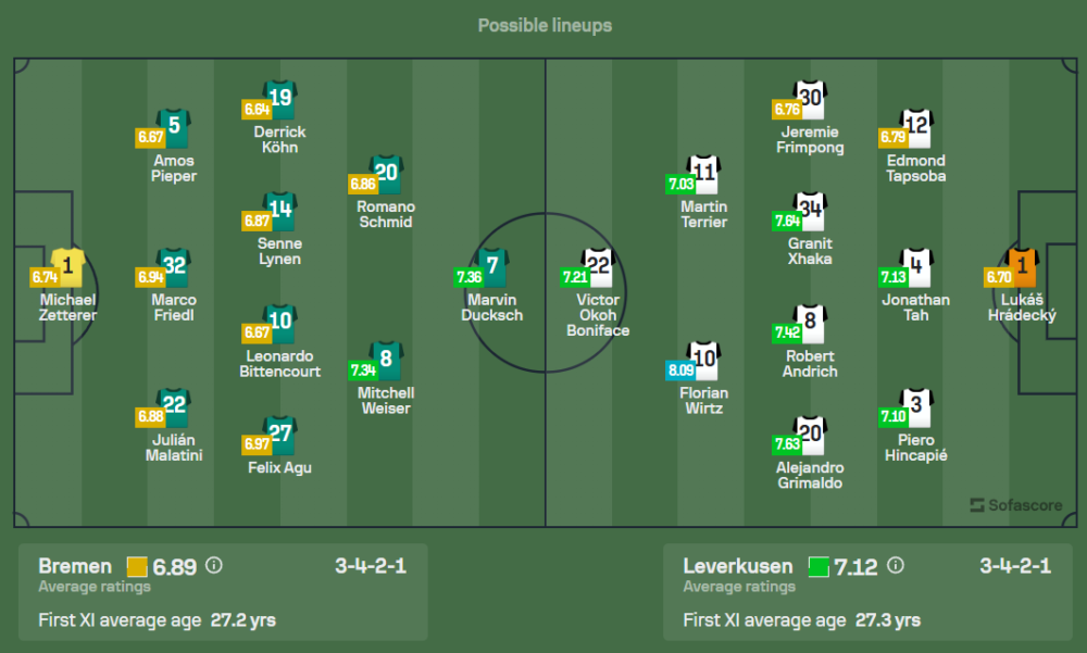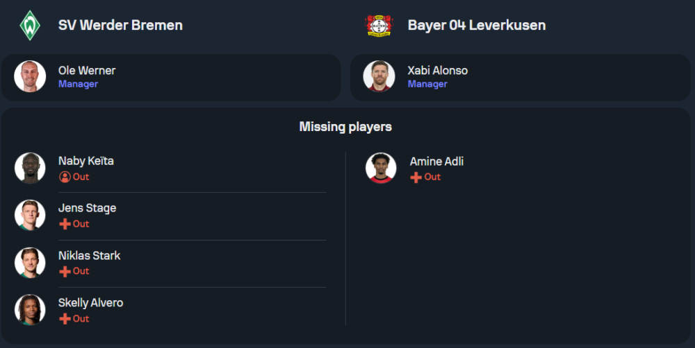 ทีมเจ้าบ้านเบรเมน ที่นำทีมโดย โอเล่ แวร์เนอร์ ต้องพบกับปัญหานักเตะเจ็บหลายราย โดยเฉพาะ แอนโธนี่ย์ ยุง ที่พลาดโอกาสลงสนามและจะถูกแทนที่ด้วย อามอส พีเพอร์ เสริมทัพแนวรับเพื่อรับมือทีมเยือน ระบบการเล่นของเบรเมนคาดว่าจะมาในรูปแบบ 3-4-2-1 นำโดยกองหน้าตัวเป้า มาร์วิน ดุ๊คช์ ที่พร้อมจะทำหน้าที่ไล่ล่าประตู