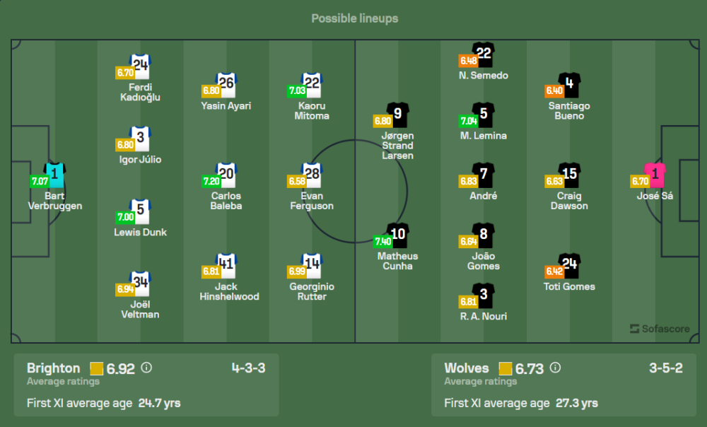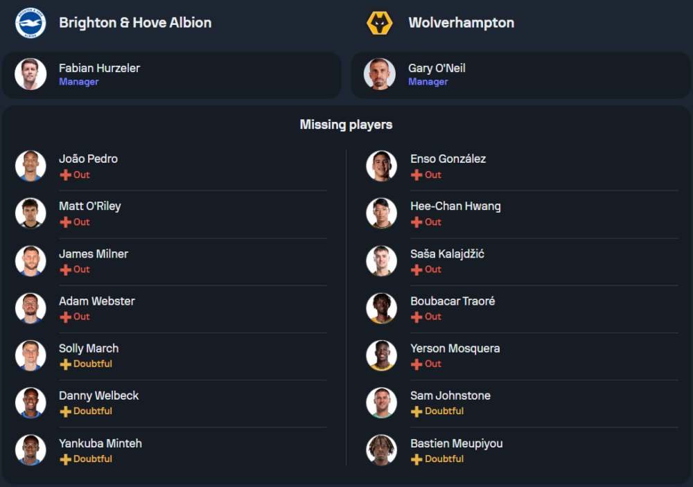 ไบรท์ตันจะไม่มีผู้เล่นสำคัญหลายรายที่บาดเจ็บเช่น เจา เปโดร, เจมส์ มิลเนอร์, แมตต์ โอริลีย์, ซอลลี่ มาร์ช และ อดัม เว็บสเตอร์ ส่วน ไซมอน ไอดินกรา, แดนนี่ เวลเบ็ค และ ยานคูบา มินเตห์ อยู่ระหว่างการเช็คความฟิต คาดว่าทีมจะมาในระบบ 4-2-3-1 นำโดย แดนนี่ เวลเบ็ค ค้ำหน้าและมี จอร์จินนิโอ รัตเทอร์ กับ คาโอรุ มิโตมะ คอยสนับสนุนในเกมรุก