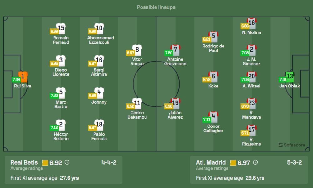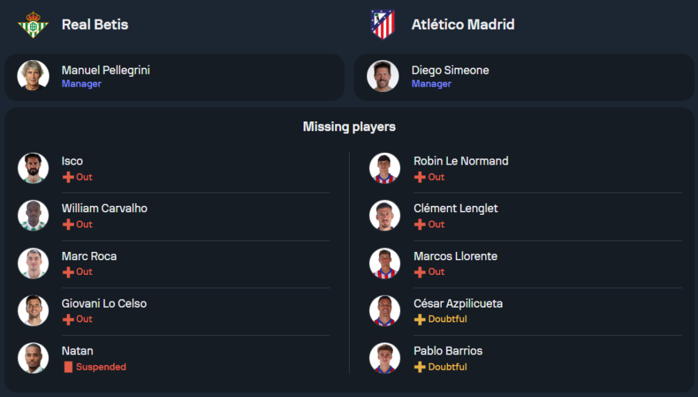 ทีมของเรอัล เบติสจะขาดผู้เล่นหลักถึง 4 คนในเกมนี้ ได้แก่ อีสโก้, วิลเลี่ยม คาร์วัลโญ่, โจวานี่ โล เซลโซ่ และ นาธาน ที่ต้องติดโทษแบน นี่เป็นความท้าทายใหญ่ที่โค้ชต้องจัดการ อย่างไรก็ตาม ยังมีแนวรุกที่พร้อมเปิดเกมเต็มที่ นำโดย บิตอร์ โรเก้ ที่จะเล่นหน้าเป้าในระบบ 4-2-3-1 เพื่อหวังทำประตูจากการสวนกลับ
