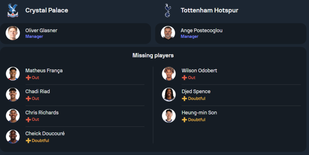 แอนจ์ ปอสเตโคกลู เฮดโค้ชสเปอร์ส ยืนยันว่า ซน ฮึง-มิน กัปตันทีมได้รับบาดเจ็บจากเกมที่ชนะเวสต์แฮมเมื่อสัปดาห์ก่อน จึงจะพลาดเกมนี้ โค้ชจะต้องพึ่งพาความสามารถของแข้งดาวรุ่ง วิลสัน โอโดแบร์ ซึ่งคาดว่าจะมาผนึกกำลังกับ เบรนแน่น จอห์นสัน และ โดมินิก โซลันกี้ ในแนวรุก ภายใต้ระบบ 4-3-3