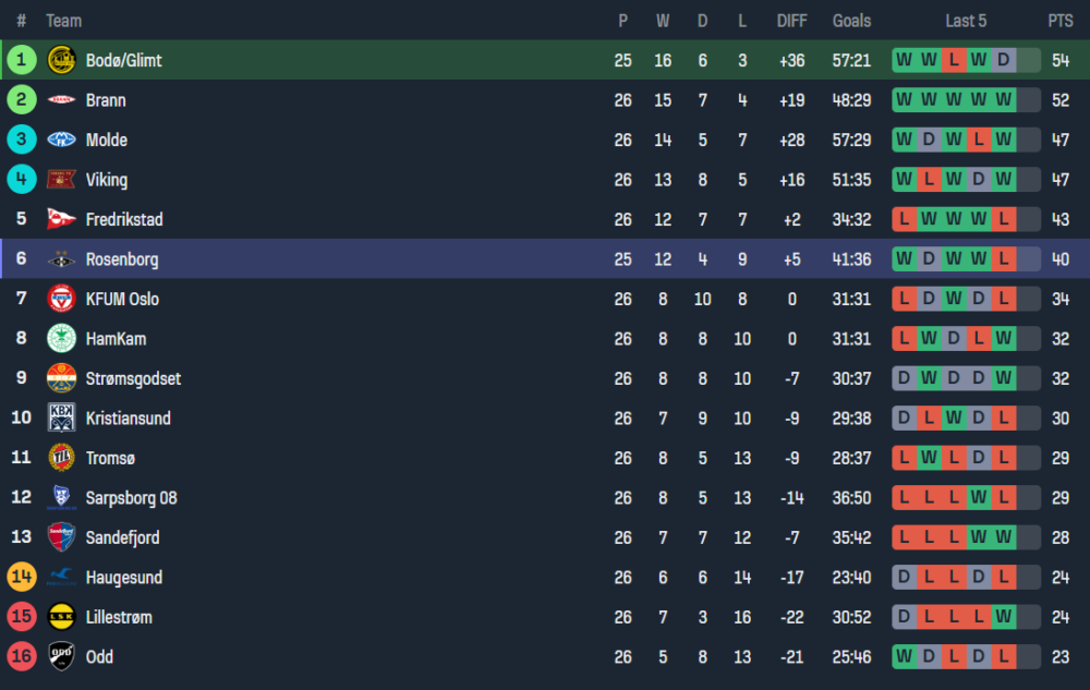 ฝั่งโรเซนบอร์กมีปัญหาด้านอาการบาดเจ็บเช่นกัน โดยขาดกองหน้าตัวเก่ง โนอาห์ ฌ็อง โฮล์ม และกองกลาง โอเล่ เซลนาเอส อย่างไรก็ตาม ทีมเยือนยังคงวางใจในแผน 4-3-3 เช่นเดียวกัน มาริอุส โบรโฮล์ม, โอเล่ เซเตอร์ และเยสเปอร์ ไรทาน-ซุนด์ จะเป็นกำลังสำคัญในการโจมตีโบโด กลิมท์ที่สนามเยือน