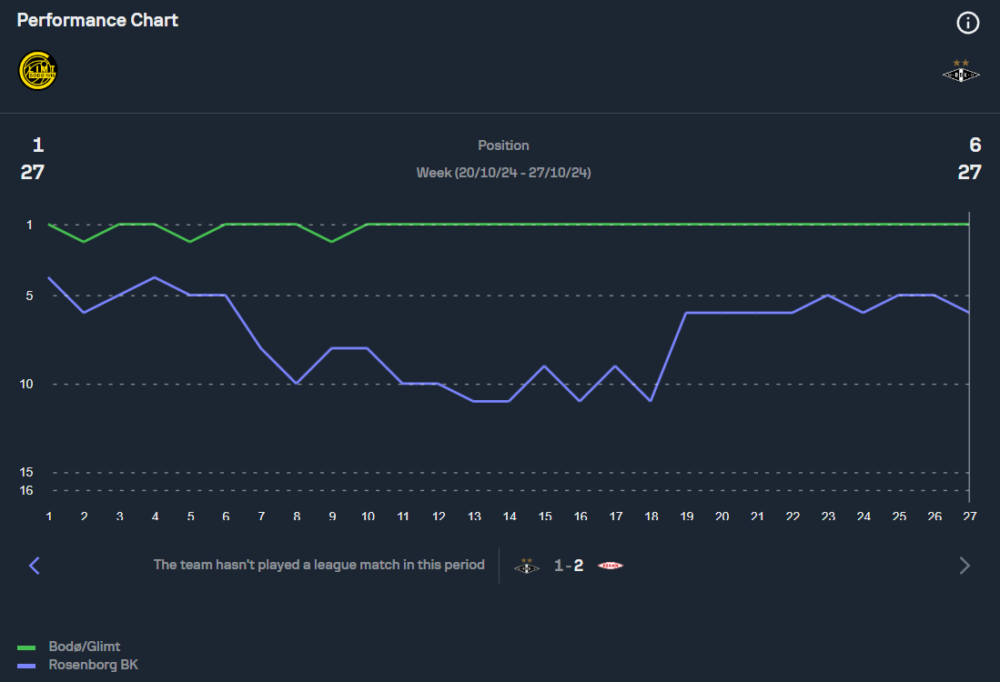 จากสถิติการพบกัน 10 นัดหลังสุด โบโด กลิมท์ ทำผลงานได้ดีกว่าอย่างชัดเจน โดยเอาชนะไปได้ 4 เกม เสมอ 4 เกม และพ่ายแพ้เพียง 2 เกมเท่านั้น ยิ่งไปกว่านั้น เกมล่าสุดที่พบกัน โรเซนบอร์กต้องยอมรับความพ่ายแพ้คาบ้านด้วยสกอร์ 1-3 ชี้ชัดว่าโบโด กลิมท์ยังคงเป็นฝ่ายที่เหนือกว่าเล็กน้อยในการเผชิญหน้ากันครั้งนี้