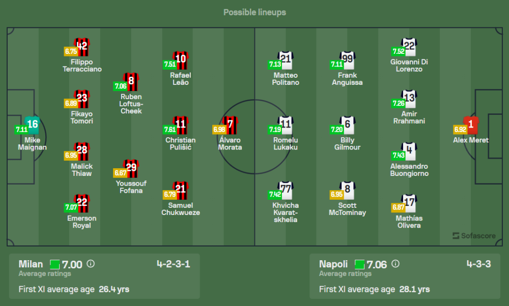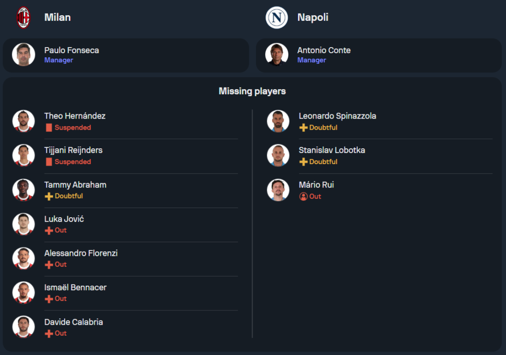 สำหรับ เอซี มิลาน ภายใต้การนำทีมของ เปาโล ฟอนเซก้า มีข่าวร้ายที่ต้องไร้เงา ทิยานี่ ไรย์นเดอร์ส กองกลางตัวเก่งเนื่องจากติดโทษแบนจากใบแดง ส่วนแบ็คซ้ายฝีเท้าฉมัง เตโอ แอร์กน็องเดซ ก็ติดโทษแบนเช่นกัน รวมถึงยังมีนักเตะบาดเจ็บสองรายคือ มัตเตโอ กับเบีย และ แท็มมี่ อับราฮัม ทำให้ความพร้อมของทีมอาจมีอุปสรรคเล็กน้อย คาดว่า ฟอนเซก้า จะใช้แผน 4-2-3-1 โดยมี อัลบาโร่ โมราต้า เป็นกองหน้าตัวเป้าที่คอยพักบอลและทำประตู