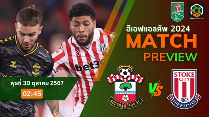 คืนวันพุธที่ 30 ตุลาคม 2567 เวลา 02.45 น. เตรียมพบกับศึกการแข่งขัน อีเอฟแอลคัพ 2024 ที่จะเป็นการประชันของ เซาแธมป์ตัน กับ สโต๊ค ซิตี้ เกมนี้ถือเป็นโอกาสทองของเซาแธมป์ตันที่จะพลิกฟอร์มการเล่น หลังจากพ่ายแพ้หลายเกมที่ผ่านมา และต้องการเรียกคืนกำลังใจให้กลับมาโดยด่วน ขณะเดียวกัน สโต๊ค ซิตี้ ก็มุ่งหวังจะกลับมาคืนฟอร์มด้วยเช่นกัน ทรรศนะบอลบ้านกีฬา มองว่านี่จะเป็นเกมที่เต็มไปด้วยแรงกดดันและการฟาดฟันสุดมันส์ที่แฟนบอลไม่ควรพลาด