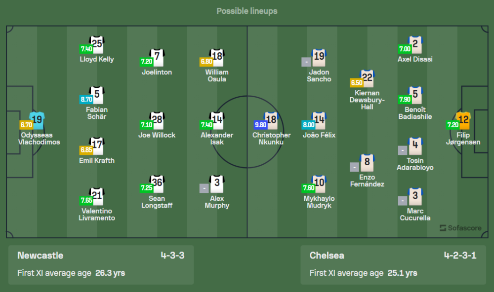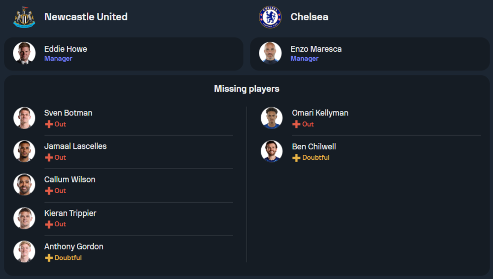 นิวคาสเซิ่ล ภายใต้การคุมทีมของ เอ็ดดี้ ฮาว กำลังเผชิญปัญหาผู้เล่นบาดเจ็บที่ส่งผลต่อแผนการเล่น โดยเฉพาะ แอนโธนี่ กอร์ดอน ตัวรุกคนสำคัญที่มีปัญหาบาดเจ็บโคนขาหนีบในการซ้อม และน่าจะไม่ได้เสี่ยงให้ลงสนาม รวมถึง คัลลั่ม วิลสัน ที่ยังต้องพักฟื้น นอกจากนี้แนวรับอย่าง จามาล ลาสเซลส์, คีแรน ทริปเปียร์ และ สเวน บ็อตแมน ก็ยังไม่พร้อมช่วยทีม ทางทีมอาจใช้ วิลเลี่ยม โอซูล่า เป็นหน้าเป้าในระบบ 4-3-3 โดยมี เจค็อบ เมอร์ฟี่ และ ฮาร์วี่ย์ บาร์นส์ คอยหนุนเกมรุกด้านข้าง
