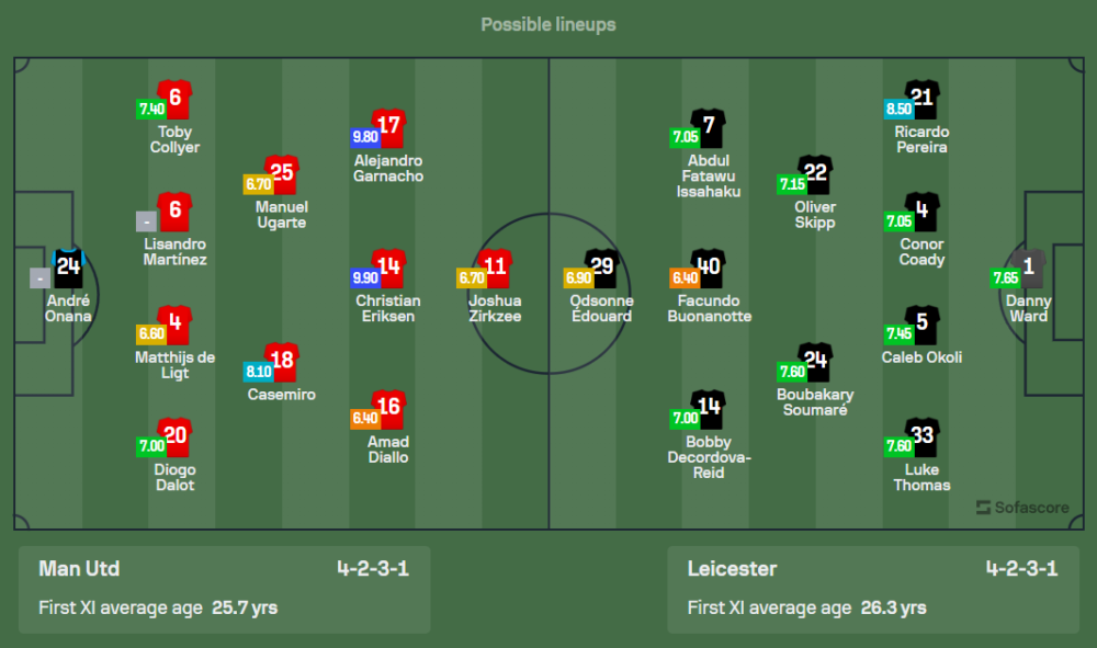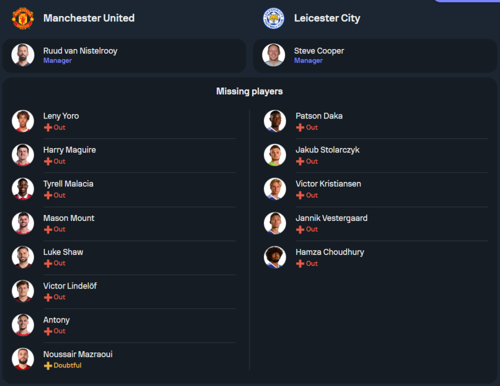การกลับมาลงสนามในเกมนี้ของ แมนเชสเตอร์ ยูไนเต็ด อยู่ภายใต้การนำของ รุด ฟาน นิสเตลรอย ตำนานศูนย์หน้าของทีมที่รับบทโค้ชรักษาการชั่วคราว ขณะนี้ทีมยังมีปัญหาบาดเจ็บมากมาย ทั้ง อันโตนี่, แฮร์รี่ แม็กไกวร์, ลุค ชอว์, ไตเรลล์ มาลาเซีย, เมสัน เมาท์ และ นูสแซร์ มาซราวี แต่คาดว่าพวกเขาจะใช้การหมุนเวียนนักเตะบางส่วน โดยวางระบบ 4-2-3-1 ใช้ โจชัว เซิร์กซี เป็นตัวล่าประตูหลัก ขณะที่ อันเดร โอนาน่า จะได้ลงเฝ้าเสาต่อเนื่อง ส่วนแนวรับมีการปรับตำแหน่ง ลิซานโดร มาร์ตีเนซ ไปเล่นทางฝั่งซ้ายแทน