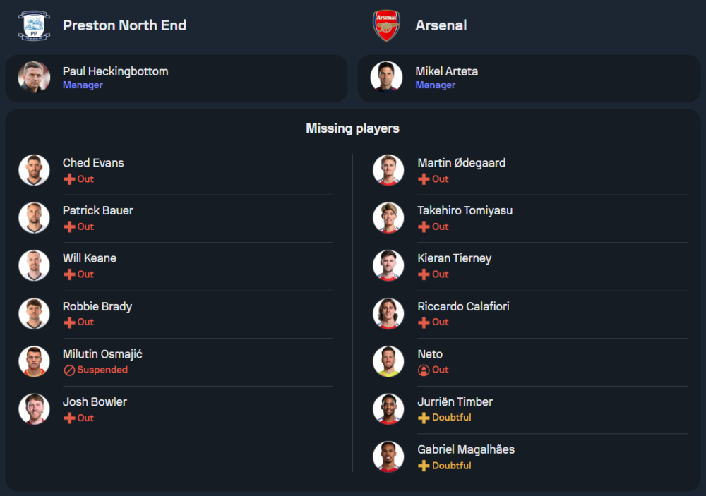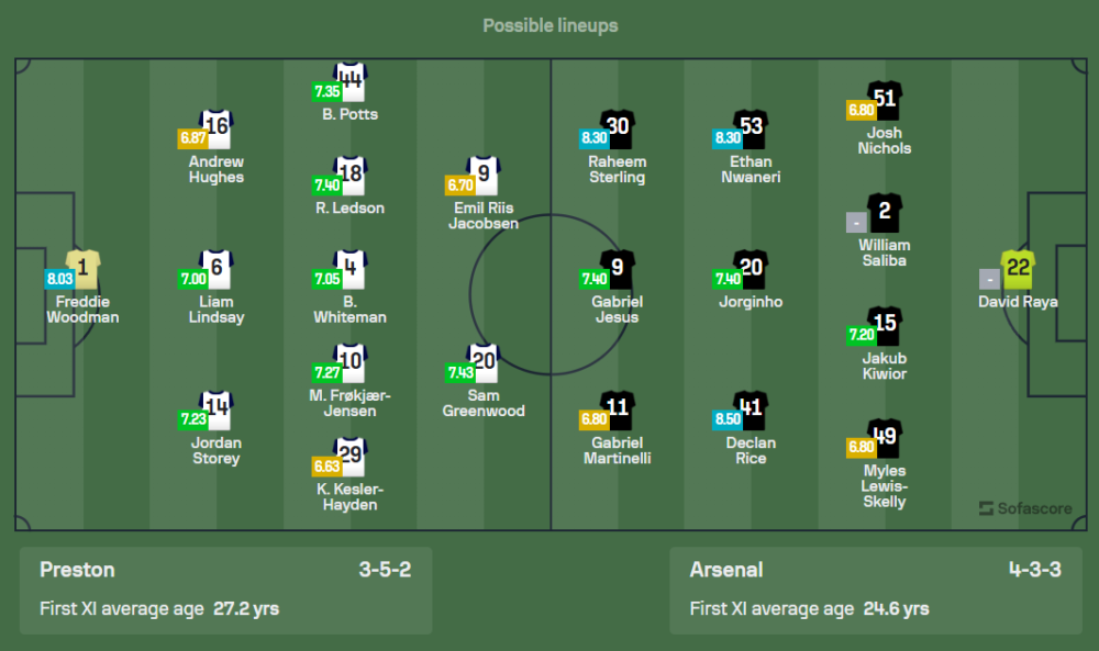 ด้านทีมเยือน อาร์เซนอล ของกุนซือ มิเกล อาร์เตต้า เตรียมพาทีมโรเตชั่นหลายตำแหน่ง โดยมี วิลเลี่ยม ซาลีบา พ้นโทษแบนกลับมาแทนคู่หู กาเบรียล มากัลเญส ที่บาดเจ็บ ขณะที่แนวรับตัวหลักยังมีผู้เล่นบาดเจ็บหลายราย เช่น เจอร์เรียน ทิมเบอร์, ทาเคฮิโระ โทมิยาซึ และ คีแรน เทียร์นี่ย์ นอกจากนี้ มาร์ติน โอเดอการ์ด จอมทัพกัปตันทีมยังไม่พร้อมลงสนามเช่นกัน ในด้านผู้รักษาประตู คาดว่า ทอมมี่ เซ็ตฟอร์ด จะได้ลงสนามในฐานะโกลสำรอง และอาร์เตต้าอาจให้โอกาสดาวรุ่งอย่าง จอช นิโคลส์ และ อีธาน เอ็นวาเนรี่ ในเกมนี้เพื่อเสริมประสบการณ์ โดยมาในระบบ 4-3-3 ที่เน้นเกมรุก