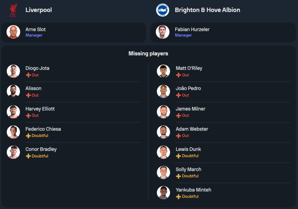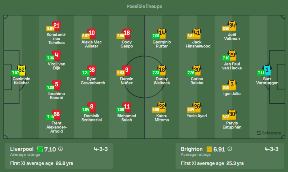 การจัดทัพของ อาร์เน่ สล็อต เตรียมส่งผู้เล่นตัวหลักคืนสนามในเกมนี้ หลังจากดร็อปบางรายในเกมคาราบาวคัพที่ผ่านมา โดยผู้เล่นสำคัญอย่าง โมฮาเหม็ด ซาลาห์, เฟอร์จิส ฟาน ไดค์, ดาร์วิน นูนเญซ และ อเล็กซิส แม็ค อัลลิสเตอร์ พร้อมกลับมาช่วยทีม ขณะที่ ควีวิน เคลเลเฮอร์ จะได้รับโอกาสเฝ้าเสาแทนที่ วิเทซสลาฟ ยารอช นอกจากนี้ คอสตาส ซิมิกาส มีลุ้นลงสนามในตำแหน่งแบ็กซ้ายเพื่อพัก แอนดรูว์ โรเบิร์ตสัน ที่เพิ่งลุยหนักมา จะมาในระบบ 4-2-3-1 พร้อมสามแนวรุก โมฮาเหม็ด ซาลาห์, โดมินิก โซบอสซ์ไล และ โคดี้ กัคโป หนุน ดาร์วิน นูนเญซ เป็นกองหน้าตัวเป้า