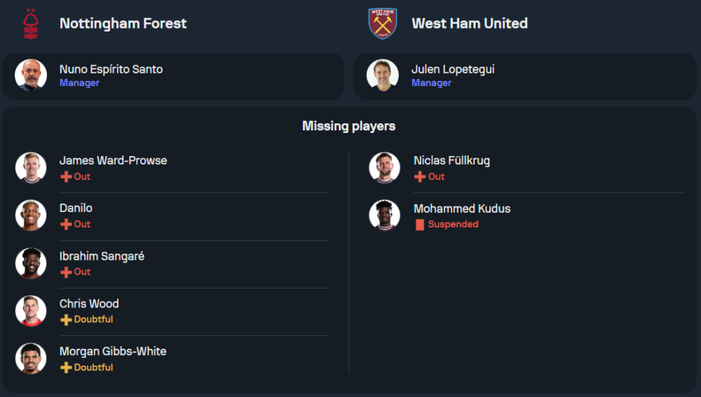 ในช่วงที่ผ่านมา น็อตติ้งแฮม ฟอเรสต์ และ เวสต์แฮม ยูไนเต็ด พบกันมาหลายครั้ง ซึ่งน่าสนใจตรงที่สถิติไม่ต่างกันมาก ล่าสุดเมื่อเดือนกุมภาพันธ์ 2024 ฟอเรสต์สามารถเก็บชัยชนะในบ้านด้วยสกอร์ 2-0 ขณะที่การเจอกันก่อนหน้านี้ในเดือนพฤศจิกายน 2023 เป็นเวสต์แฮมที่ชนะ 3-2 การพบกันทั้งหมด 10 นัดหลังสุด ฟอเรสต์ชนะ 5 นัด และเวสต์แฮมชนะ 5 นัด สถิติที่ใกล้เคียงกันเช่นนี้ ทำให้เกมนี้เต็มไปด้วยความท้าทาย