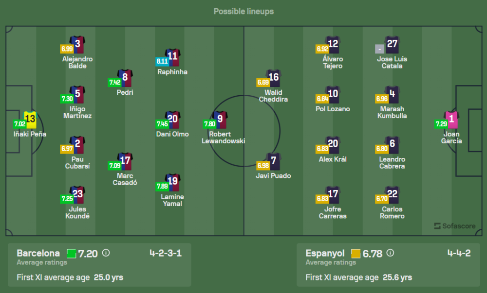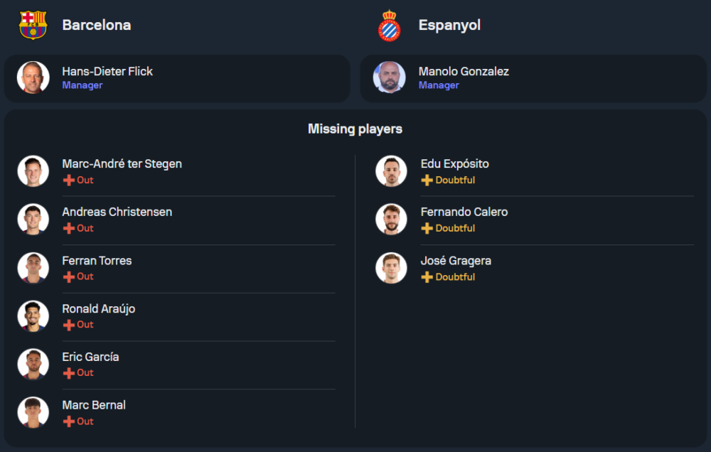 ทีมเจ้าบ้านยังคงมีปัญหาผู้เล่นบาดเจ็บอย่างต่อเนื่อง ไม่ว่าจะเป็น มาร์ก อันเดร แตร์ สเตเก้น นายทวารมือหนึ่งที่ปิดเทอมยาว รวมถึงกองหลังตัวหลักอย่าง โรนัลด์ อาเราโฆ่, เอริค การ์เซีย, อันเดรียส คริสเตนเซ่น และตัวรุก เฟร์ราน ตอร์เรส ที่ไม่สามารถลงสนามได้ คาดว่า ชาบี เอร์นานเดซ จะใช้แผน 4-2-3-1 โดยมี โรเบิร์ต เลวานดอฟสกี้ เป็นหัวหอกหลัก พร้อมสนับสนุนจากแนวรุกอย่าง ลามีน ยามาล, ดานี่ โอลโม่ และ ราฟินญ่า