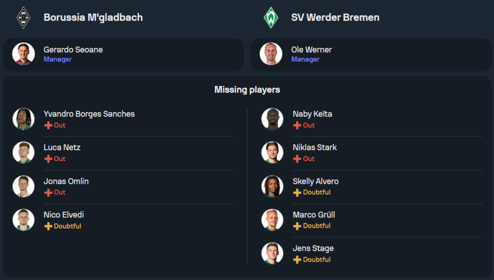 ทีมเยือน แวร์เดอร์ เบรเมน ฟอร์มการเล่นไม่คงที่ โดยเฉพาะการเล่นนอกบ้านที่ยังไม่สามารถเก็บแต้มสำคัญได้ ข้อผิดพลาดในเกมรับทำให้พวกเขามักเสียประตูง่ายๆ อย่างไรก็ตาม การเปลี่ยนแปลงในตัวผู้เล่นและแผนการเล่นที่ปรับตัวใหม่หวังจะช่วยให้พวกเขามีโอกาสสู้ในเกมนี้ได้มากขึ้น