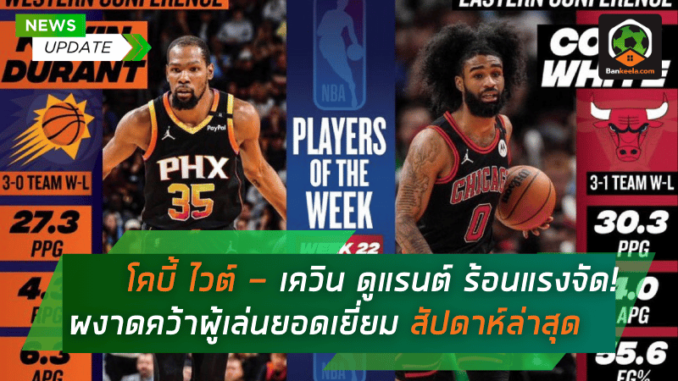 โชว์ฟอร์มแบบไม่มีใครกล้าปฏิเสธสำหรับสองดาวเด่นแห่ง NBA อย่าง โคบี้ ไวต์ การ์ดตัวเก่งของ ชิคาโก บูลล์ส และ เควิน ดูแรนต์ ซูเปอร์สตาร์ฟอร์เวิร์ดของ ฟีนิกซ์ ซันส์ ที่คว้ารางวัล ผู้เล่นยอดเยี่ยมประจำสัปดาห์ ไปครองคนละฝั่งอย่างยิ่งใหญ่ในศึก NBA สัปดาห์ที่ผ่านมา