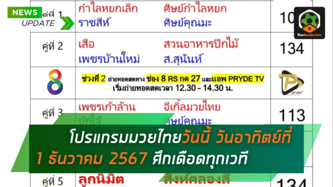 โปรแกรมมวยไทย วันอาทิตย์ที่ 1 ธันวาคม 2567