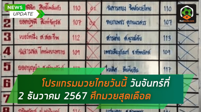 โปรแกรมมวยไทยวันนี้ วันจันทร์ที่ 2 ธันวาคม 2567 มวยไทยสุดมันจัดเต็มหลากหลายเวที ไม่ว่าจะเป็น ศึกมวยไทยพันธมิตร ที่เวทีมวยกองทัพอากาศ ถ่ายทอดสดทั้งทาง True4U , Youtube และ บ้านกีฬา กลุ่มพลังใหม่ รวมถึงรายการใหญ่อื่น ๆ ที่กำลังรอแฟนมวยไทยติดตามชม