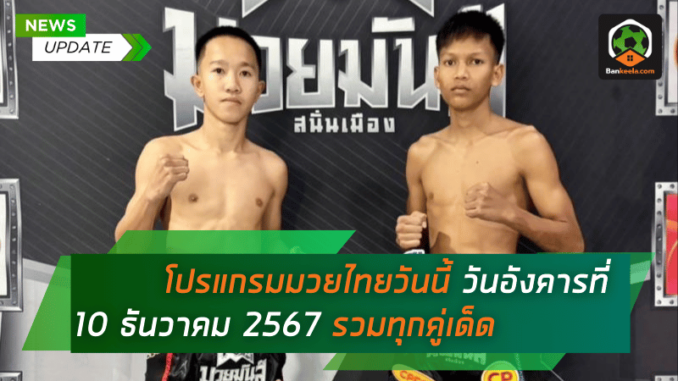 แฟนมวยไทยไม่ควรพลาด! วันนี้ วันอังคารที่ 10 ธันวาคม 2567 เตรียมพบกับศึกมวยไทยสุดมันส์ที่มาพร้อมโปรแกรมอัดแน่นทั้งรายการใหญ่และคู่เอกดุเดือด ทุกเวทีสำคัญ อาทิ มวยไทย 7 สี, ศึก ONE ลุมพินี, ศึกจ้าวมวยไทย ช่อง 3, ศึก RWS ราชดำเนิน เวิลด์ซีรีส์, มวยมันส์วันศุกร์, และ ศึกเพชรยินดี