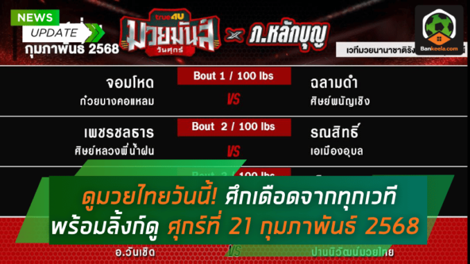 คอมวยไทยเตรียมตัวให้พร้อม! ศึกกำปั้นสุดมันส์ วันศุกร์ที่ 21 กุมภาพันธ์ 2568 ขนทัพนักชกชั้นนำจากหลากหลายเวทีมาให้รับชมกันแบบจุใจ ไม่ว่าจะเป็น ศึกมวยมันส์วันศุกร์, ศึก ONE ลุมพินี, ศึกจ้าวมวยไทย ช่อง 3, ศึก RWS ราชดำเนิน เวิลด์ซีรีส์ และ ศึกเพชรยินดี พร้อมลิ้งก์ ดูมวยสด ให้แฟนหมัดมวยติดตามแบบไม่พลาดทุกคู่สำคัญ!