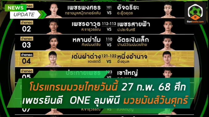 แฟนหมัดมวยเตรียมตัวให้พร้อม! โปรแกรมมวยไทยวันนี้ วันพฤหัสบดีที่ 27 กุมภาพันธ์ 2568 อัดแน่นไปด้วยศึกเดือดจากเวทีดังทั่วประเทศ ไม่ว่าจะเป็น ศึกเพชรยินดี ที่เวทีราชดำเนิน, ศึก ONE ลุมพินี สังเวียนระดับโลกที่เวทีลุมพินี และ มวยมันส์วันศุกร์ ที่เวทีมวยรังสิต ZIANMUAY งานนี้คอมวยห้ามพลาด! พร้อมลิ้งก์ดูมวยสดให้ติดตามทุกคู่สำคัญ