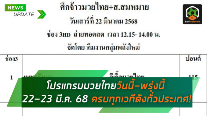 ณ สนามมวยเวทีลุมพินี เวลา 10.00 – 12.00 น. ถ่ายทอดสดทาง ช่อง 7HD The Boxing และ บ้านกีฬา