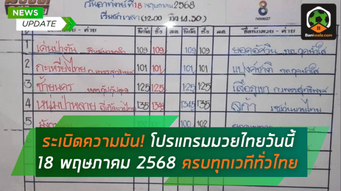 แฟนกำปั้นห้ามพลาดเด็ดขาด! โปรแกรมมวยไทยวันนี้ วันอาทิตย์ที่ 18 พฤษภาคม 2568 เตรียมเปิดศึกเดือดบนสังเวียนทั่วประเทศ ทั้งรายการใหญ่สุดคลาสสิกอย่าง มวยไทย 7 สี, ศึกท่อน้ำไทย เกียรติเพชร ทีเคโอ, ศึกมวยดีวิถีไทย, รวมถึงเวทีระดับนานาชาติอย่าง ไทยไฟท์ ที่ขนยอดนักชกไทยฟัดนักชกต่างชาติแบบจัดหนัก พร้อมถ่ายทอดสดให้ชมกันครบทุกเวทีแบบเรียลไทม์ ใครเชียร์มวยอยู่บ้านรับรองสะใจเต็มอารมณ์แน่นอน