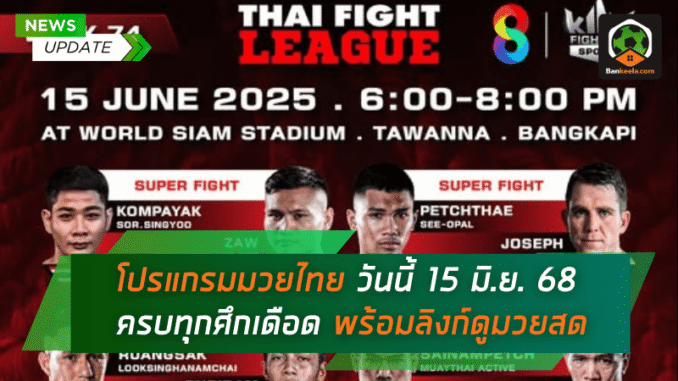 ศึกกำปั้นไทยวันอาทิตย์ที่ 15 มิถุนายน 2568 เรียกได้ว่าจัดเต็มทุกเวทีแบบไม่มีพัก! แฟนหมัดมวยห้ามกระพริบตา เพราะ โปรแกรมมวยไทยวันนี้ เตรียมส่งความระอุขึ้นทุกสนามทั่วประเทศ ตั้งแต่มวยช่อง 7 สีที่แฟนมวยรอติดตามกันทุกสัปดาห์ ไปจนถึงศึกเดือดระดับอินเตอร์อย่าง RWS และไทยไฟท์ บ้านกีฬา รวบรวมตารางมวยครบทุกคู่ พร้อมช่อง ดูมวยไทย สดออนไลน์ผ่านลิงก์จาก BANKEELA ให้คุณไม่พลาดทุกหมัดเด็ด เข่าโหด และน็อกเอาต์สะท้านเวที