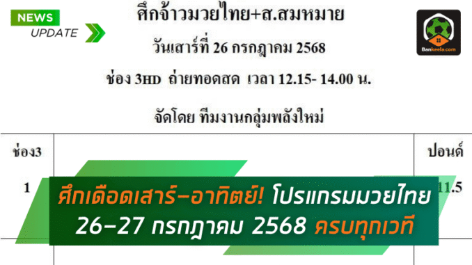 สุดสัปดาห์นี้วงการกำปั้นไทยเดือดเป็นไฟ! แฟนมวยเตรียมระเบิดอารมณ์กับ โปรแกรมมวยไทย ที่แน่นสุด ๆ ครอบคลุมทุกเวที ตั้งแต่ มวยไทย 7 สี, ศึก RWS ราชดำเนิน, Fairtex Fight, ศึกจ้าวมวยไทย, ไปจนถึง ศึกท่อน้ำไทย เกียรติเพชร ทีเคโอ ซึ่งถ่ายทอดสดให้รับชมผ่านช่องทางต่าง ๆ ทั้งช่องหลักและออนไลน์ โดยเฉพาะบน BANKEELA ที่รวมลิงก์ ดูมวยไทย เอาไว้ครบทุกสนาม พลาดไม่ได้ด้วยประการทั้งปวง!