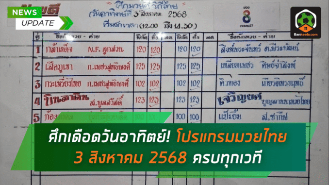 วันอาทิตย์ที่ 3 สิงหาคม 2568 นี้ เหล่าคอมวยไทยห้ามพลาดด้วยประการทั้งปวง! เพราะศึกกำปั้นทั่วประเทศระเบิดความมันสะเทือนทั้งเวที ไม่ว่าจะเป็น มวยไทย 7 สี, ศึกไทยไฟท์, RWS ราชดำเนินเวิลด์ซีรีส์, หรือ ศึกเกียรติเพชร TKO ต่างขนยอดมวยตัวจี๊ดขึ้นสังเวียนให้แฟน ๆ ได้ชมกันแบบจุใจ ใครกำลังหา โปรแกรมมวยไทยวันนี้ หรืออยากดู ดูมวยไทย สดแบบฟรี ๆ วันนี้ BANKEELA จัดให้ครบจบในโพสต์เดียว!