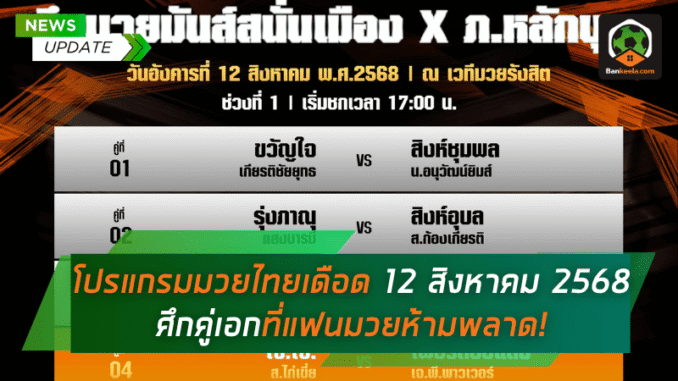 เตรียมระเบิดความมันส์กลางสัปดาห์กับ โปรแกรมมวยไทยวันนี้ วันอังคารที่ 12 สิงหาคม 2568 จัดเต็มทั้งคู่มวยคุณภาพและช่องทาง ดูมวยไทย ครบทุกศึก ไม่ว่าจะเป็น มวยไทย 7 สี, ศึก ONE ลุมพินี, ศึกจ้าวมวยไทย ช่อง 3, ศึก RWS ราชดำเนิน เวิลด์ซีรีส์, ไทยไฟท์, และ ศึกเพชรยินดี ซึ่งบอกเลยว่าคืนนี้คือค่ำคืนที่คอมวยตัวจริงไม่ควรพลาดแม้แต่วินาทีเดียว ใครอยากรู้ว่าใครขึ้นสังเวียนบ้าง และจะ ดูมวยสด ได้ที่ไหน เรารวมให้ครบในที่เดียว
