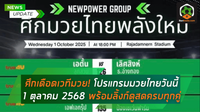 เปิดศึกความมันแห่งวงการกำปั้นไทย! โปรแกรมมวยไทยวันนี้ วันพุธที่ 1 ตุลาคม 2568 แฟนมวยทั่วประเทศห้ามพลาด บ้านกีฬา ขนตาราง มวยไทยครบทุกศึก ทั้ง ศึกมวยไทยพลังใหม่, ONE ลุมพินี, ศึกจ้าวมวยไทย ช่อง 3, RWS ราชดำเนิน เวิลด์ซีรีส์, ไทยไฟท์ และ ศึกเพชรยินดี พร้อมลิ้งก์ดูถ่ายทอดสดครบทุกช่วงให้รับชมกันแบบเรียลไทม์