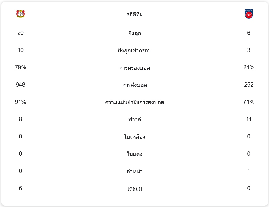 - การยิงทั้งหมด: เลเวอร์คูเซิน 20 ครั้ง – ไฮน์เดนเฮลม์ 6 ครั้ง