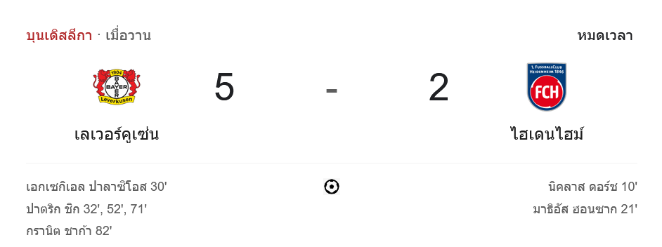 - การครองบอล: เลเวอร์คูเซิน 79% – 21% ไฮน์เดนเฮลม์