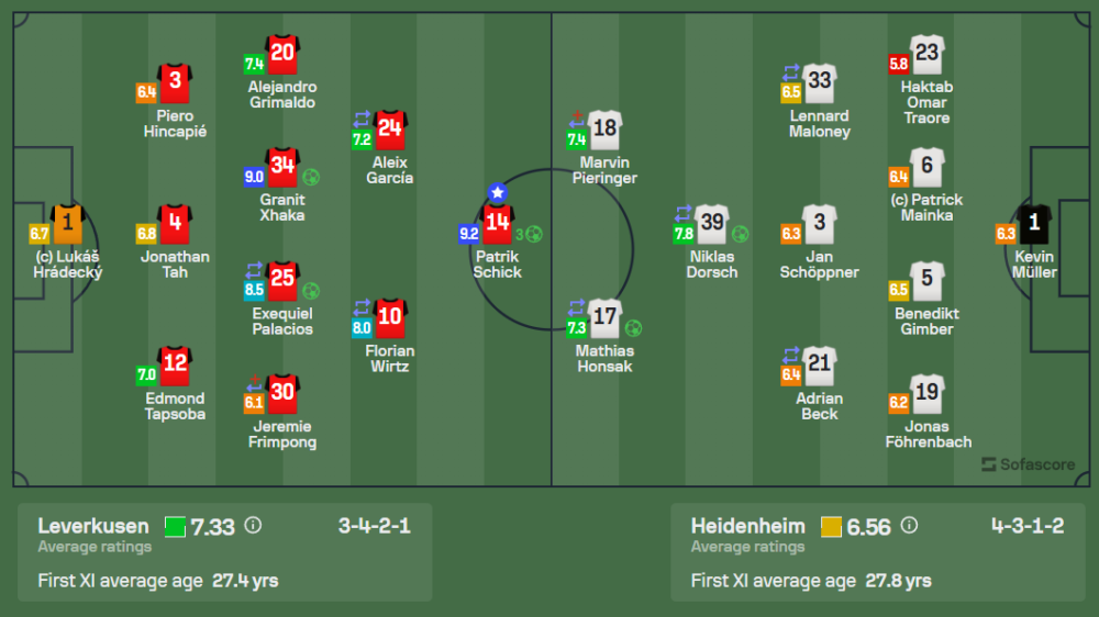 เลเวอร์คูเซิน ใช้ระบบ 3-4-2-1 เน้นการทำเกมผ่านปีกและใช้กองกลางตัวรุกอย่าง กรานิต ชาก้า และ เอเซเกียล ปาลาซิออส เชื่อมเกม ส่วนเกมรับของทีมยังแข็งแกร่งจากความเร็วและความแน่นอนของแผงหลัง ไฮน์เดนเฮลม์พยายามใช้จังหวะโต้กลับ แต่การครองบอลเพียง 21% ของพวกเขาแสดงถึงการถูกกดดันหนักตลอดเกม