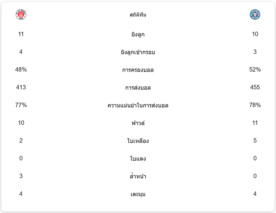 เกมนี้ ซังค์ เพาลีมีโอกาสยิง 11 ครั้ง เข้ากรอบ 4 ครั้ง ครองบอล 48% ขณะที่โฮลสไตน์ คีลยิง 10 ครั้ง เข้ากรอบ 3 ครั้ง แต่ครองบอลได้มากกว่า 52% การจ่ายบอลของทั้งสองทีมอยู่ในระดับสูง แต่เจ้าถิ่นสร้างโอกาสได้เฉียบขาดกว่า