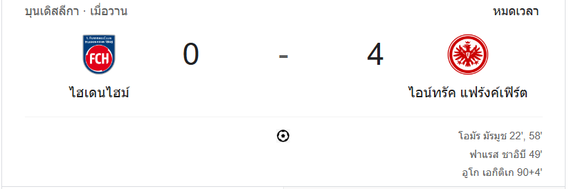 บ้านกีฬา พาคุณสู่ผลบอลสดศึกบุนเดสลีกาคืนนี้ ที่สนามของไฮเด้นไฮม์ แฟร้งค์เฟิร์ตโชว์ฟอร์มดุ เอาชนะไปด้วยสกอร์ 4-0 โดยได้ประตูจาก โอมาร์ มาร์มูช (2 ประตู), ฟาเรส ไชบี และฮูโก้ เอกิติเก้ ชัยชนะนี้ทำให้ทีมเยือนคว้าสามแต้มสำคัญ พร้อมขยับอันดับในตารางได้อย่างยอดเยี่ยม