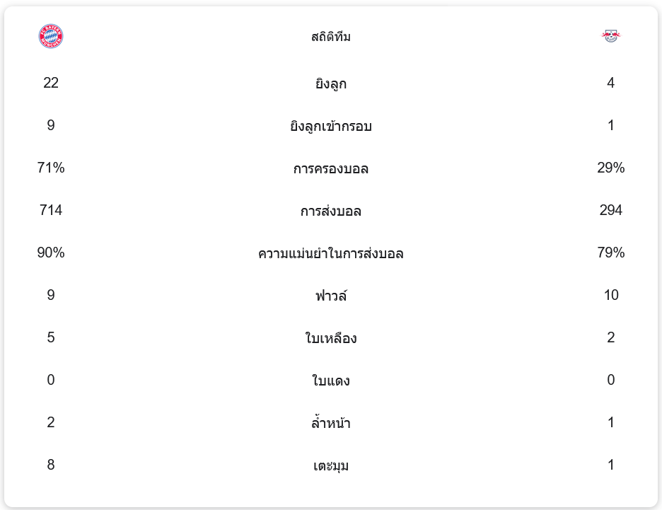 บาเยิร์น ครองบอลถึง 71% เทียบกับ ไลป์ซิก ที่ทำได้เพียง 29% บาเยิร์นมีโอกาสยิงถึง 22 ครั้ง โดยเข้ากรอบ 9 ครั้ง ขณะที่ ไลป์ซิก มีโอกาสยิงเพียง 4 ครั้ง เข้ากรอบแค่ 1 ครั้ง การส่งบอลของบาเยิร์นยังแม่นยำกว่าอย่างชัดเจนที่ 90% จากการส่งบอลทั้งหมด 714 ครั้ง