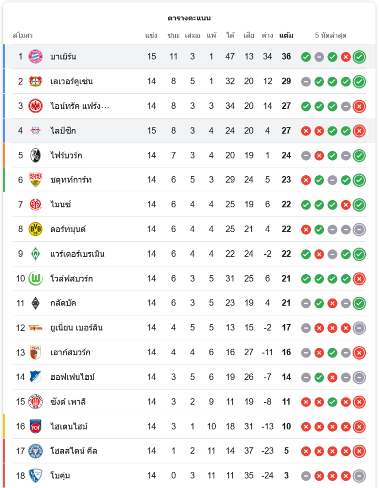 ชัยชนะครั้งนี้ทำให้ บาเยิร์น มิวนิค มี 36 คะแนนจาก 15 นัด ยังคงนำเป็นจ่าฝูงอย่างเหนียวแน่น ขณะที่ แอร์เบ ไลป์ซิก อยู่อันดับที่ 4 มี 27 คะแนน