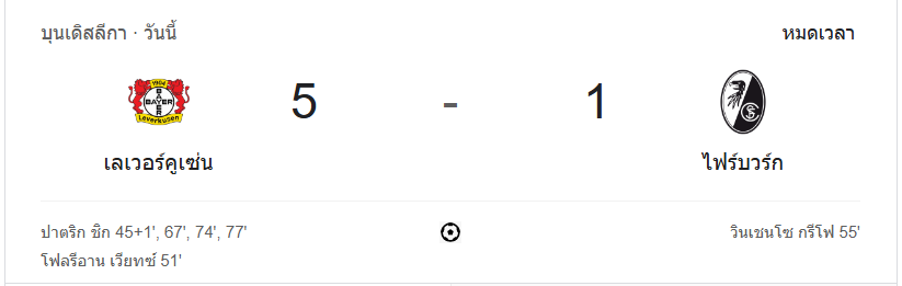 นาทีที่ 90+3: ผู้ตัดสินเป่านกหวีดหมดเวลา เลเวอร์คูเซินเอาชนะไฟร์บวร์กไปด้วยสกอร์ 5-1