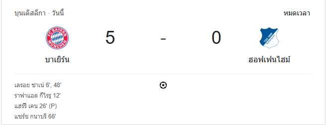 นาทีที่ 50: กรรมการเป่านกหวีดจบครึ่งแรก บาเยิร์นนำฮอฟเฟ่นไฮม์ 3-0
