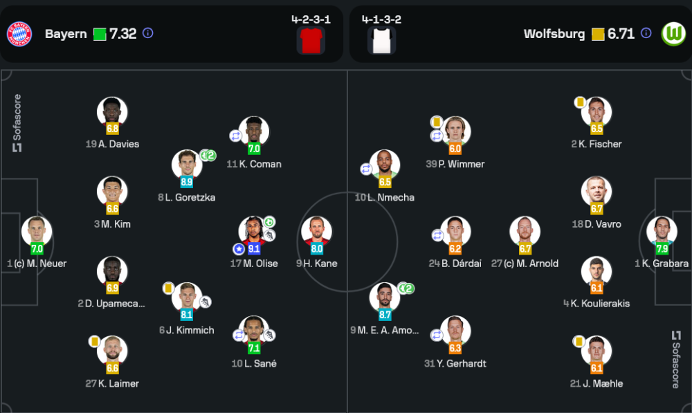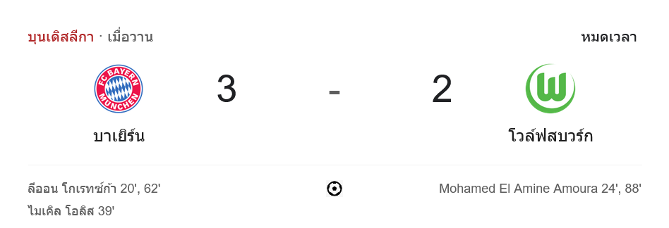 - ยิงเข้ากรอบ: บาเยิร์น 10 – 3 โวล์ฟสบวร์ก